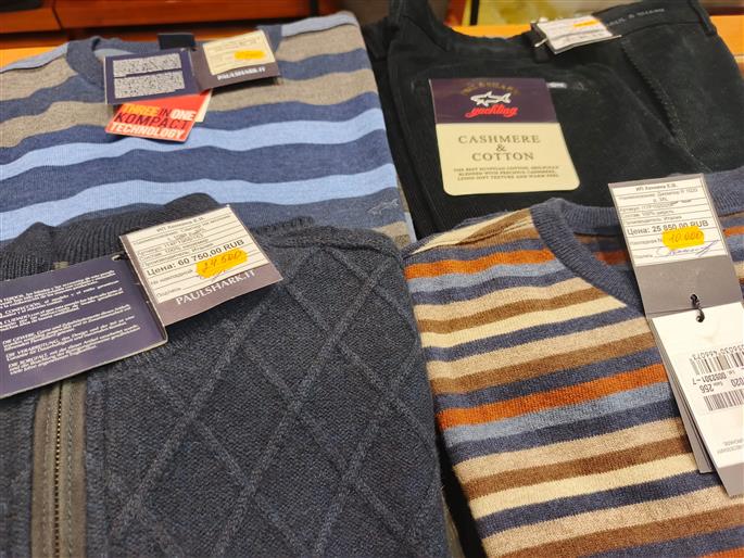 Скидки на мужскую коллекцию тоже существенные. Например, кашемировый джемпер, который стоил 60 тысяч рублей, теперь продают за 24,5 тысячи рублей. Цены на джинсы снижены с 18 до 7 тысяч рублей. Есть в ассортименте и обувь, стоимость которой также уменьшают в связи с ликвидацией ассортимента магазина.