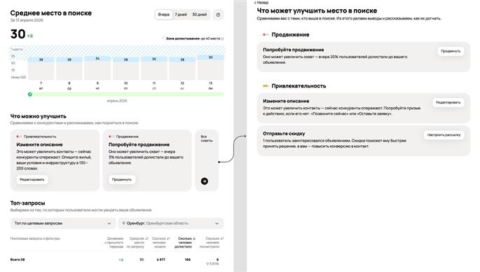 "Среднее место в поиске" показывает, на каких позициях находятся объявления, как эта позиция меняется со временем и доходят ли до объявлений пользователи при просмотре выдачи. Например, если объявление находится ниже зоны, до которой долистывают пользователи, система прямо укажет на это и предложит продавцу конкретные действия: доработать объявление, предложить покупателям скидки или усилить продвижение.